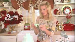 In order to make sure the cakes stack well, she uses the green icing as an adhesive.