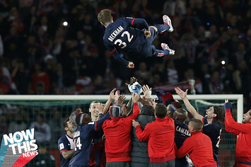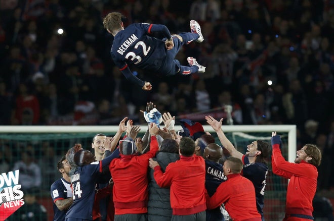 Fans and team-mates celebrate David Beckham after his final home game before retirement.