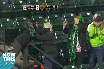 Rockies first baseman Todd Helton fouled into the stands last night playing against the San Francisco Giants. The ball flew straight into the waiting glove of this elderly fan... and apparently made her day.