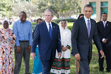 George W. Bush joined Obama on the last leg of his Africa trip to visit the memorial site of an Al Qaeda attack in Tanzania. The former president hopes to help Obama promote an economic partnership between the U.S. and the ever-strengthening continent.