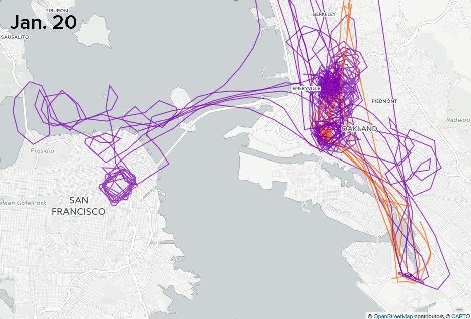 The San Francisco Bay Area was a notable exception to the pattern of sparse aerial surveillance of the weekend’s protests. Both on Friday and Saturday, the Oakland Police and the California Highway Patrol (CHP) circled downtown Oakland, where protesters gathered over the weekend. The CHP also circled protest locations in San Francisco, including City Hall.
