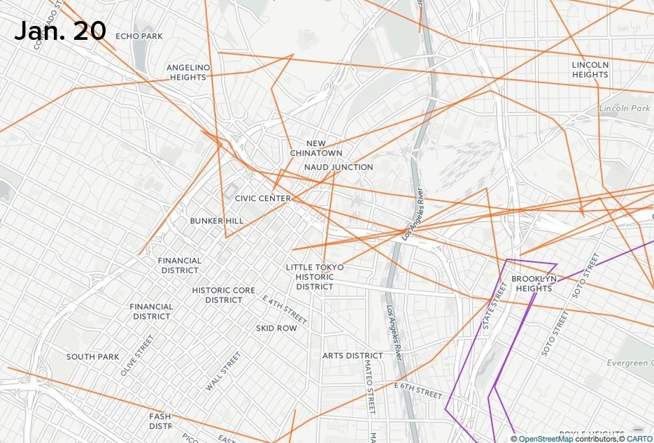 In the maps below, drawn from Flightradar24 data, the tracks of federal aircraft are shown in green, state police in purple, and local law enforcement in orange. Slide to the right to see flights on Friday Jan. 20, the day of the inauguration, and to the left to see flights on Saturday Jan. 21, when women’s marches and other protests took place across the nation. (Days are from midnight to midnight, local time.)