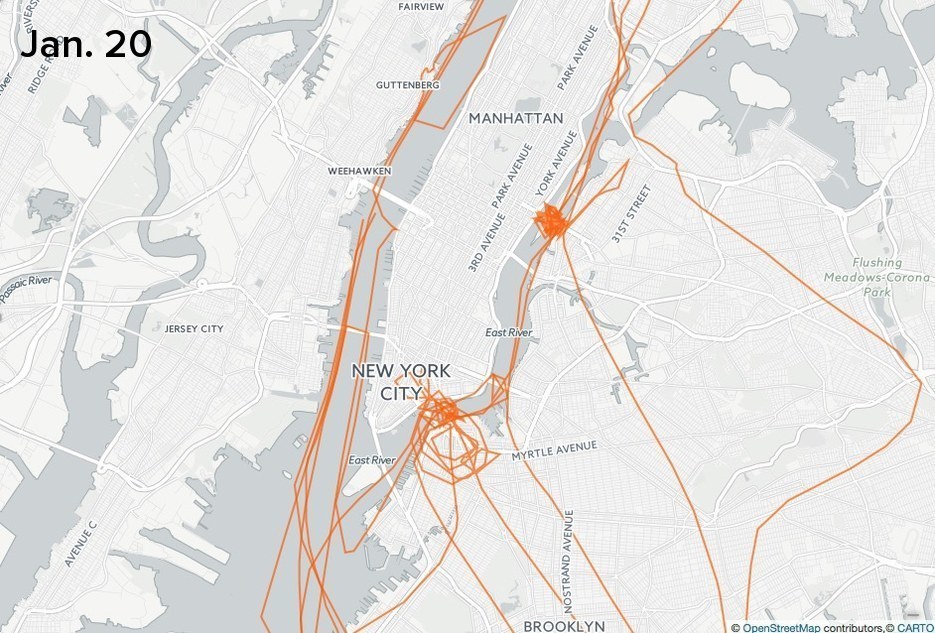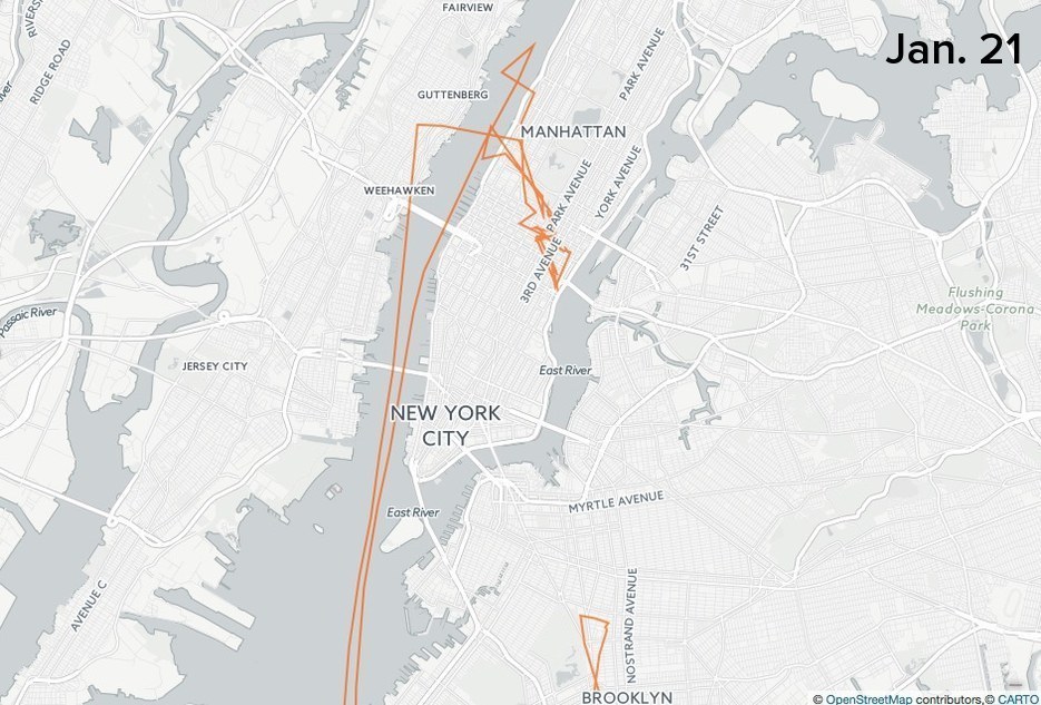 The NYPD has an extensive fleet of helicopters, but they were not especially busy over the inauguration weekend. On Friday, they monitored bridges over the East River, which is a common pattern. On Saturday, a lone NYPD chopper meandered over Manhattan.