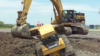 345CL Excavator Pulls Out 2 Deere Dozers From a Canal "Stuck?"
