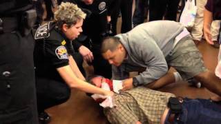 Man put two games under his shirt because his grandson got knocked down and hurt in the rush and he needed his hands to help his grandson. A cop saw and immediately arrested him for shoplifting. The man was cooperating while the cop was putting on the handcuffs. The cop out of no where tripped the man and bashed his head nose first into the ground knocking him out and there is blood everywhere. The cop did not know how to care for the man so someone that was there shopping had to help get blood out the mans airways.