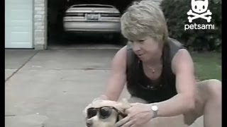 A woman is totally obsessed with her dog whom she calls biker dog, hollywood, and scooter puppy. After puttng on his biking gear, they take off down the road on a giant chopper.