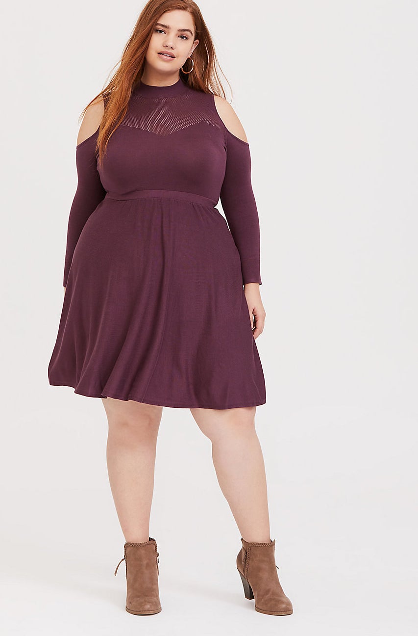 26. A plus-size mock-neck skater dress with cute mesh detail and shoulder cutouts. Pop on a jacket to avoid a literal ~cold shoulder~ outside, but in the warm indoors, let those shoulders breathe!