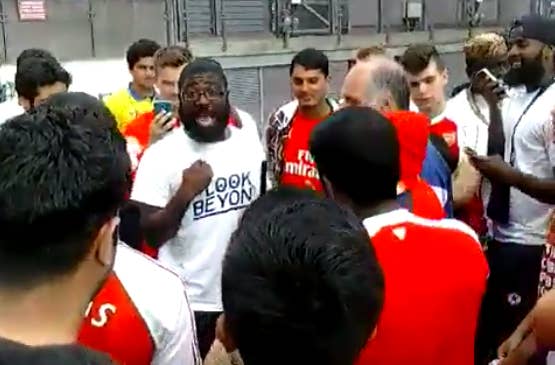 The guy in the white t-shirt is a Manchester United fan who is winding up Arsenal fans about "history".