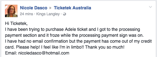 Adele fans have flooded Ticketek's Facebook page with complaints and reports that the site was crashing at the purchase point.