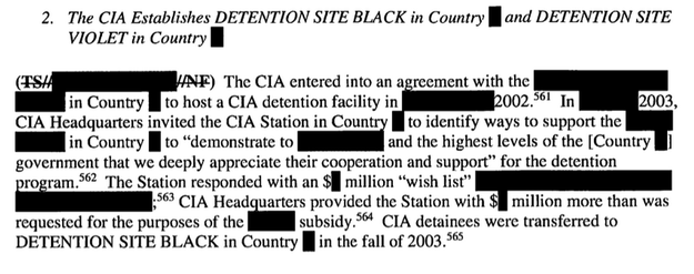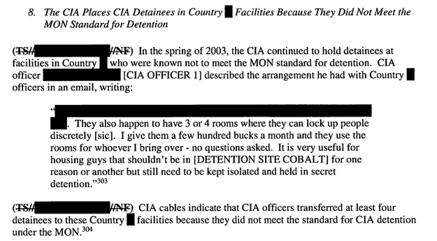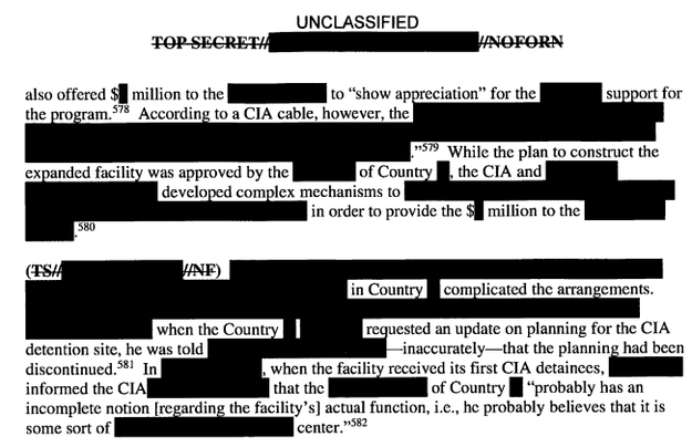 The report says that with one of the countries, the detention facility created “ongoing difficulties” — until the CIA gave them an undisclosed number of million dollars, after which “officials, for Country [REDACTED] political leadership, indicated that Country [REDACTED] was now flexible with regard to the number of CIA detainees at the facility and when the facility would eventually be closed.”