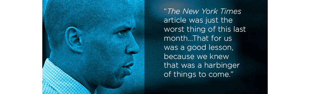 But it was last month’s brutal New York Times takedown of Booker’s tenure in Newark — “Promise vs. Reality in Newark on Mayor’s Watch” — that nearly unraveled Booker. The piece argued that Booker “has proven to be a better marketer than mayor.” He responded by going on the offensive, crafting a point-by-point rebuttal with his team to send to a Huffington Post media reporter. The paper says it stands “wholeheartedly” by its reporting on the mayor’s tenure in Newark, though it did issue a correction regarding the full context of a tweet, as well as other details unrelated to Booker’s record.