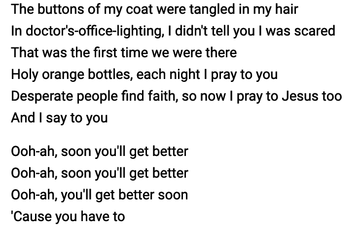 On CBS Sunday Morning, Taylor talked about the song. "There's one song on the album, called 'Soon You'll Get Better.' I can't even listen to it."