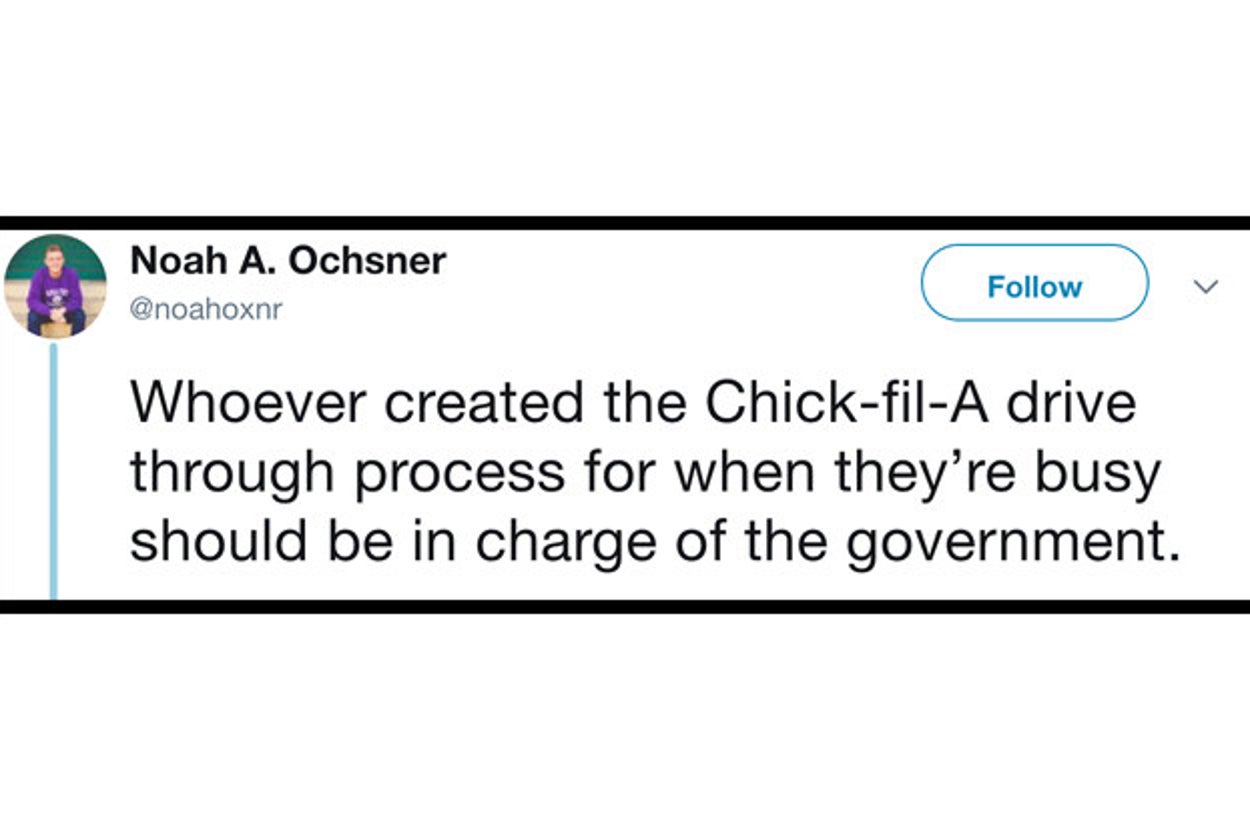 Whoever created the Chick-fil-A drive through process for when they’re busy should be in charge of the government.
