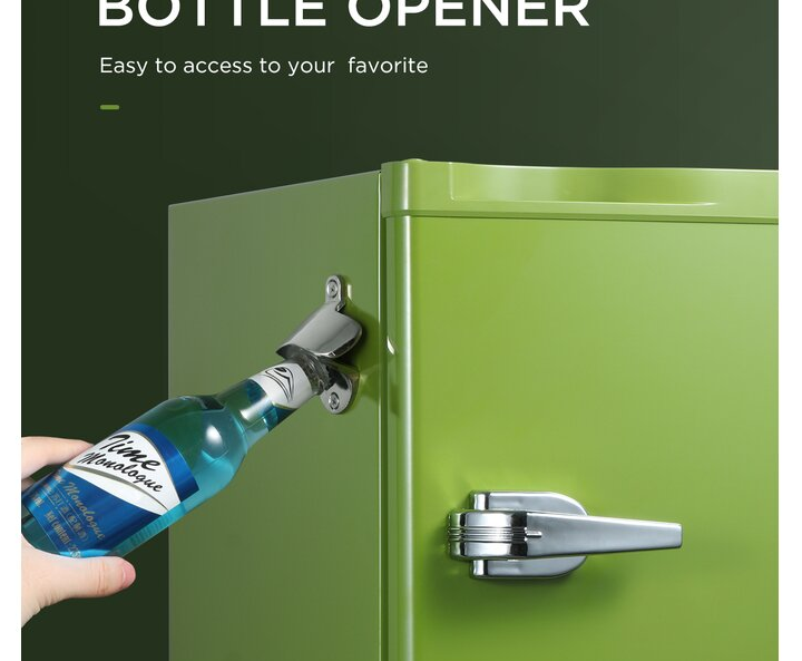 9. A Grinch-green freestanding fridge to double the retro vibes and the ❄️chill❄️ vibes in your living space. It features two surprisingly spacious shelves, as well as a small freezer box, latch handle, and a bottle opener so you can easily crack open some retro pop (or maybe an *adult* beverage).