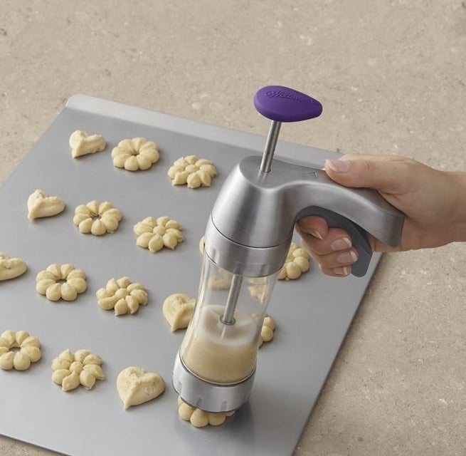 11.A cookie press with 12 discs to prepare cookies in a variety of fun shapes.