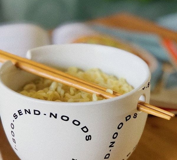 13. A funny noodle bowl and chopstick set that'll definitely be put to good use — sometimes, the thought of coming home after a long day at work or school and cooking in your tiny AF apartment kitchen just doesn't sound as good as heating up some ramen noodles.