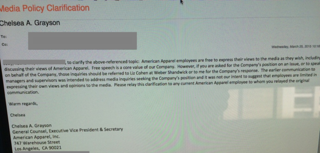 Chelsea Grayson, the company’s general counsel, told a group of employees on March 25 that American Apparel staff “are free to express their views to the media as they wish, including discussing their views of American Apparel,” according to an email obtained by BuzzFeed News. She said that American Apparel’s previous policy, implemented in January, “was intended to address media inquiries seeking the Company’s position and it was not our intent to suggest that employees are limited in expressing their own views and opinions to the media.” She noted that requests for comment on behalf of the company should still be referred to her or American Apparel’s external spokeswoman.