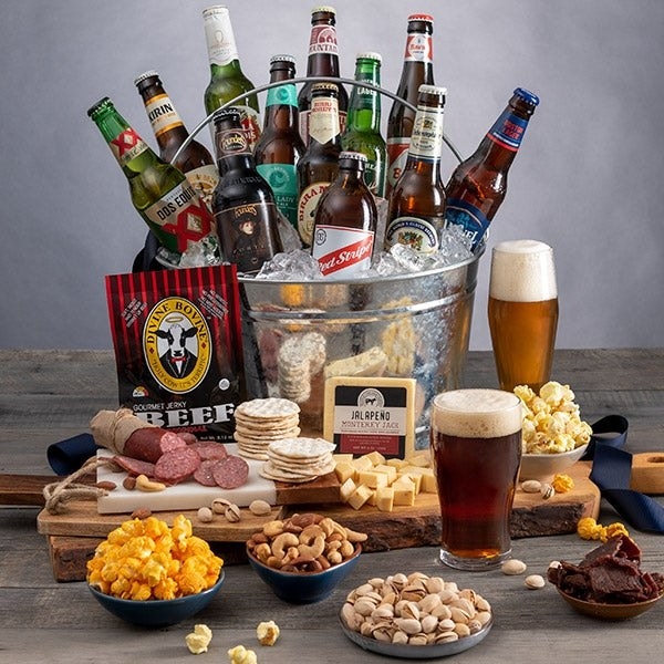 Get the Country Inn Breakfast gift basket (left) for $74.99 and the Around the World Beer Bucket (right) for $169.99.