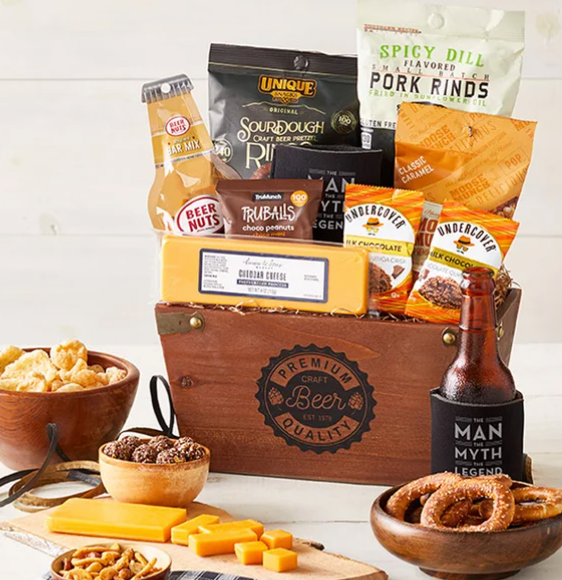 Get the newborn girl baby gift basket (left) for $109.99 or the Dad's Vintage Beer Crate & Snacks gift basket (right) for $29.99.