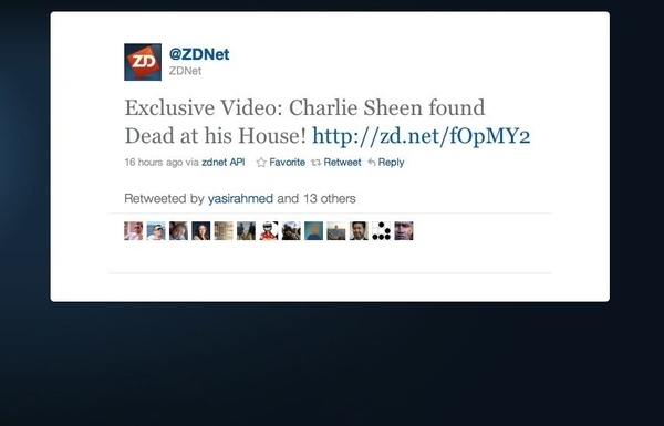 Clicking links claiming that Charlie Sheen is dead (exactly what you just did) can lead you to the virus that is rapidly spreading through Facebook. Charlie Sheen is "fine". This is just the latest scheme clickjackers are using to spread a virus on Facebook, Twitter, and YouTube.