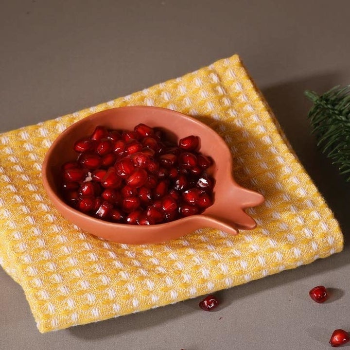 29. This whimsical snack bowl in the shape of a pomegranate - ₹198, a very trendy motif right now, or this mustard-coloured, stoneware, pomegranate-shaped vase - ₹237