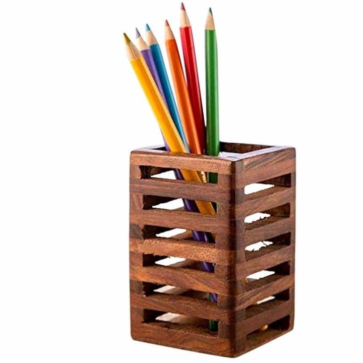 26. A classic black mesh pen stand - ₹69 or a handmade wooden pencil stand - ₹99 to hold your overflowing collection of writing instruments.