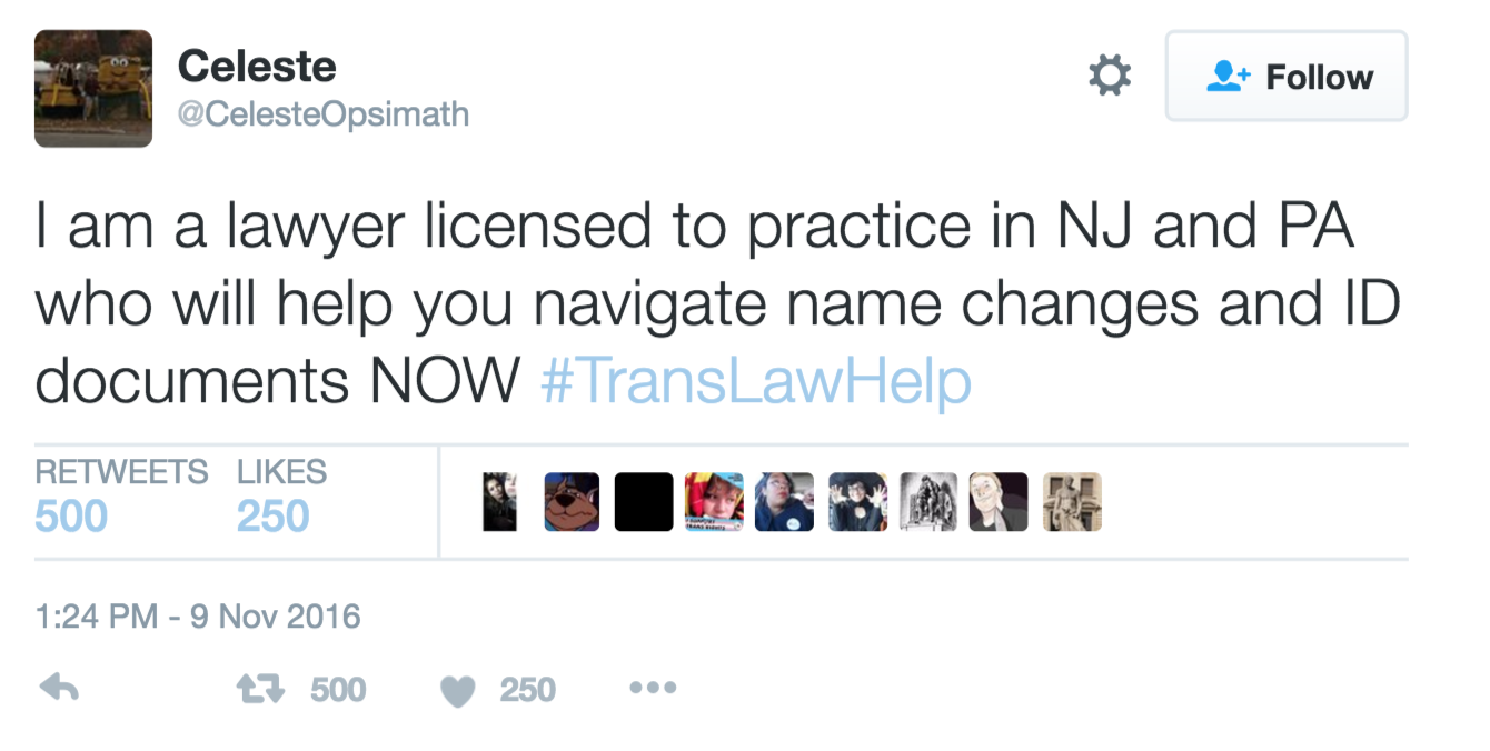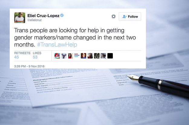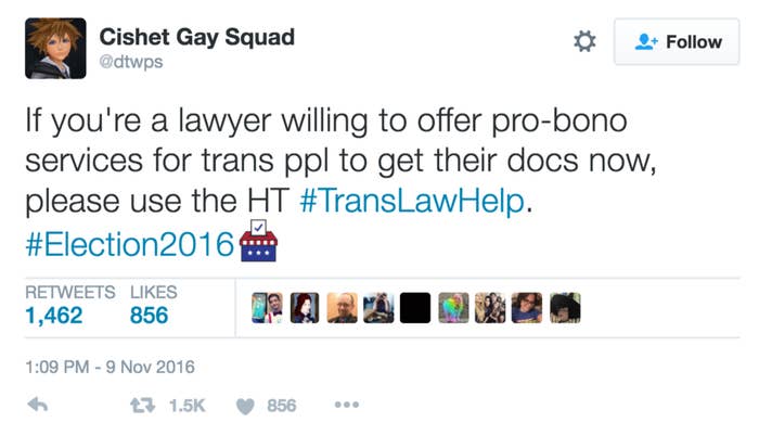 Figuring that others might be feeling the same sense of urgency and anxiety following the election, the 30-year-old New Yorker told BuzzFeed News they decided to start the hashtag to connect trans people with legal aid.