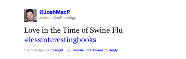 The hashtag #lessinterestingbooks is having a moment on Twitter right now. I think #14 is my favorite, although it could be a good read. What's yours?