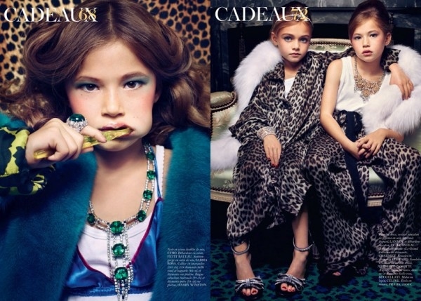 Entitled Cadeaux, this article in the Dec-Jan issue of Vogue Paris is a perfect example of how you DON'T want to showcase kids in a fashion magazine. If you must do a kids x couture shoot, this is how you do it. (Via TrendLand who seem to think it's "adorable.")