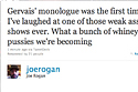 "Gervais' monologue was the first time I've laughed at one of those weak ass shows ever. What a bunch of whiney pussies we're becoming" -Rogan