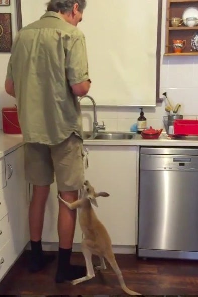 Barns posted the video on Tuesday of this little guy eager for a treat. The joey even clings to his leg at one point.
