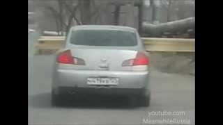 The driver has taken to the streets with a pile of wooden planks sticking out of both passenger windows of his car. He's seen dodging other cars and obstacles as he travels down the street in Vladivostok. He barely manages to avoid disaster.