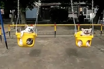 A couple of French Bulldogs enjoy a relaxing moment on a swing set. They're just like a couple of kids!