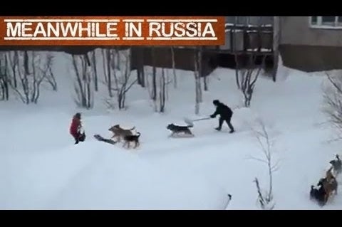 The guy uses a snow shovel to scare the stray dogs away.