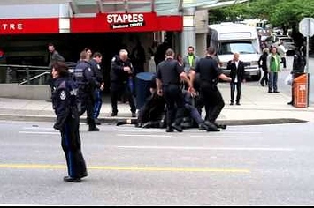 This is a clip of the end of the police stand off with the man who was waving a sword in downtown Vancouver at the corner of Georgia and Burrard Streets.