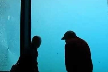 The two men, filming the side of the bear's enclosure, capture the animal swimming around before they are caught by surprise as a rock thunders against the glass.