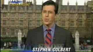 Colbert is very good at staying deadpan approx. 99.9 % of the time. This is one of the few, ultra-hilarious times he couldn't handle it.