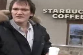 Quentin Tarantino getting his cup of coffee and is annoyed by this paparazzi. He then lets the paparazzi know how he feels about that.