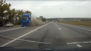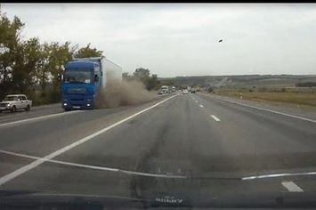 While driving on the highway the truck tire exploded. Fortunately, no one was hurt.
