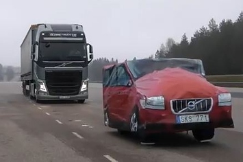 On a test track in the new Volvo FH, together with test drivers you get to experience how the Collision Warning with Emergency Brake system can avoid a rear end collision, even if its tight! The tractor trailer is fully loaded to 40 tons GCW.