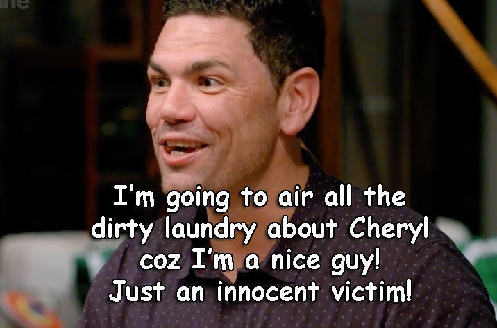Back in Cheryl and Andrew's no-kissing world, Cheryl's dad gave Andrew an absolute spray. Like, I think a literal spray, because he was so mad his face went red and I swear I saw him spitting. First Cheryl's dad had a go at Andrew's stature, conveniently ignoring they were both a similar height. Then he pretended he actually liked douchey Trumpy Jonathan, Cheryl's first "husband". Then he GRILLED Andrew on his clothing choice (ratty grey shirt, so fair enough tbh), and made him change before he came back into the house. "I will find you, and I will KILL YOU," he screamed in his best Liam Neeson impression, as Andrew ran for the door. For some reason Andrew had a whole new outfit ready to go in the car... I'm not saying this is SUSPICIOUS, and fake drama at all, but it seems rather suspicious and fake.