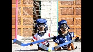 Like most Canadians, Crusoe and brother Oakley set up a casual street hockey game in their driveway. Except they are dogs. Dachshunds. From Canada. In teeny tiny hockey jerseys. RIP me.