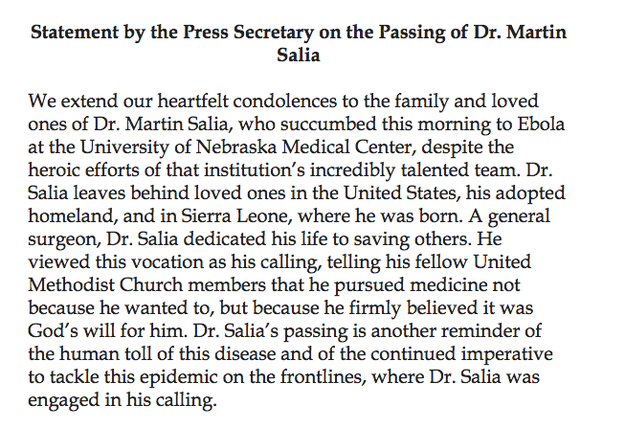 In a statement, President Obama said Salia’s death is “another reminder of the human toll of this disease.”