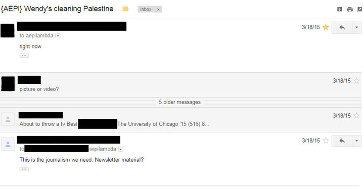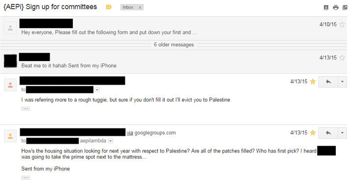 In two other email chains, sent in March and April 2015, some brothers refer to an empty lot filled with gravel and weeds next to the fraternity’s apartment building as “Palestine,” the member who provided the messages explained.