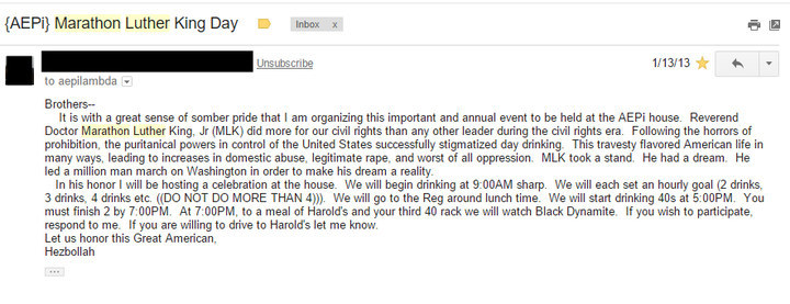 One member sent an email to the listerv in January 2013, saying he was organizing “Marathon Luther King Jr. Day” — comprised of day drinking, eating at a restaurant famed for its fried chicken, and watching Black Dynamite, a film parodying the Blaxploitation genre of movies.