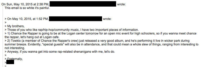 Another email, from May 2015, provides details about an upcoming performance by a rapper and addresses the brothers as, “those of you who like rap/hip-hop/community music.”