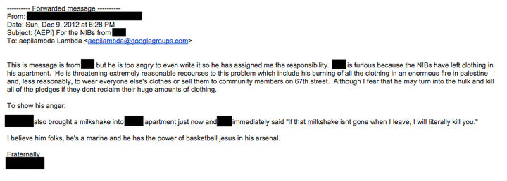 An email from December 2012 talks about how one member, who was angry about other brothers leaving their clothes in his apartment, planned to burn all the clothes “in an enormous fire in Palestine” or “sell them to community members on 67th street.”