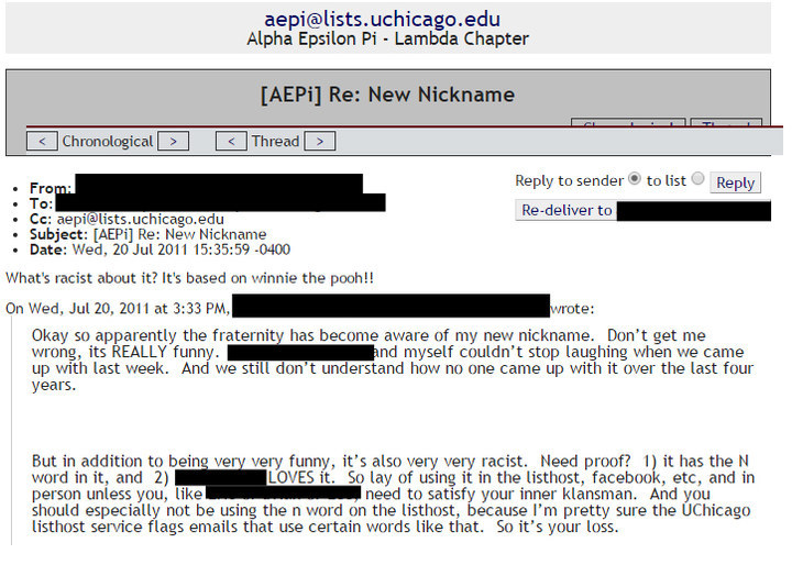 In another email from July 2011, a brother warns the chapter not to use his nickname which has the n-word in it, because despite being “very very funny, it’s also very very racist.” The brother asks the chapter not to use his nickname on Facebook, in emails, or in person, unless “you need to satisfy your inner klansman,” he writes.