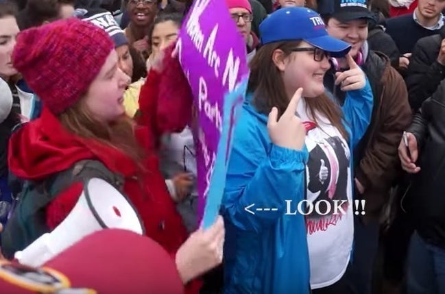 In the video, the girl — wearing a blue Trump hat and a Trump T-shirt — is seen posing for a photo in front of anti-Trump protesters.
