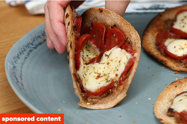 3) Next, top each tortilla with some of the crushed tomato along with the pepperoni and pieces of mozzarella cheese to cover.